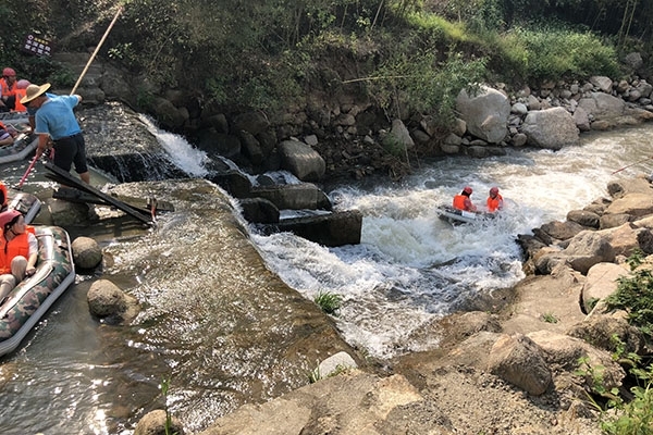 之后迎来重头戏——漂流。在安全员的介绍培训后,男女一组坐上了气垫筏,在等待开闸漂流的时间,抛弃了身份,性别,打起了水仗,不得不说这是加深同事感情的不二法门。300米的落差,跟随水流,一路向下,打着水仗,嬉嬉闹闹,即便全身湿透,仍然玩的不亦乐乎。