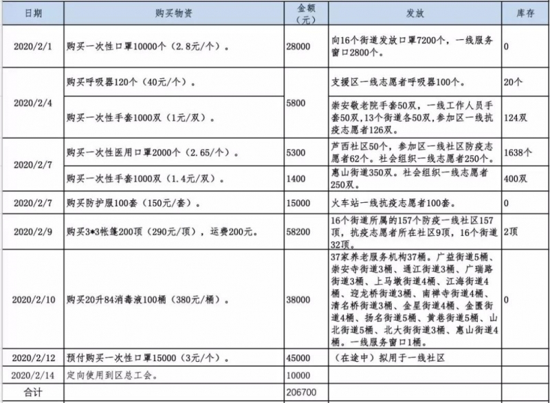 截至2020年2月14日17时,共接受捐赠资金55.1808万元,支出20.67万元,结余34.5108万元。