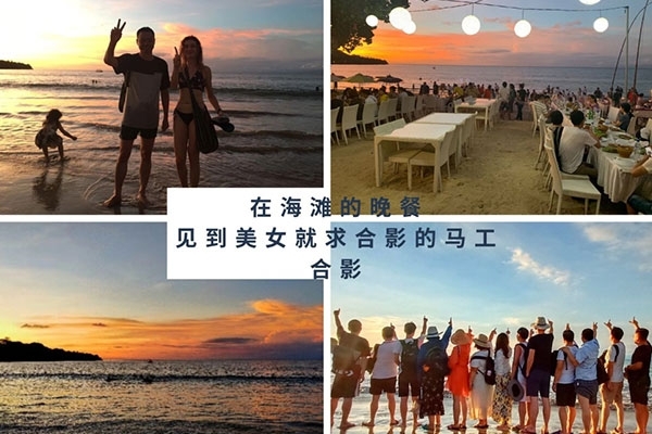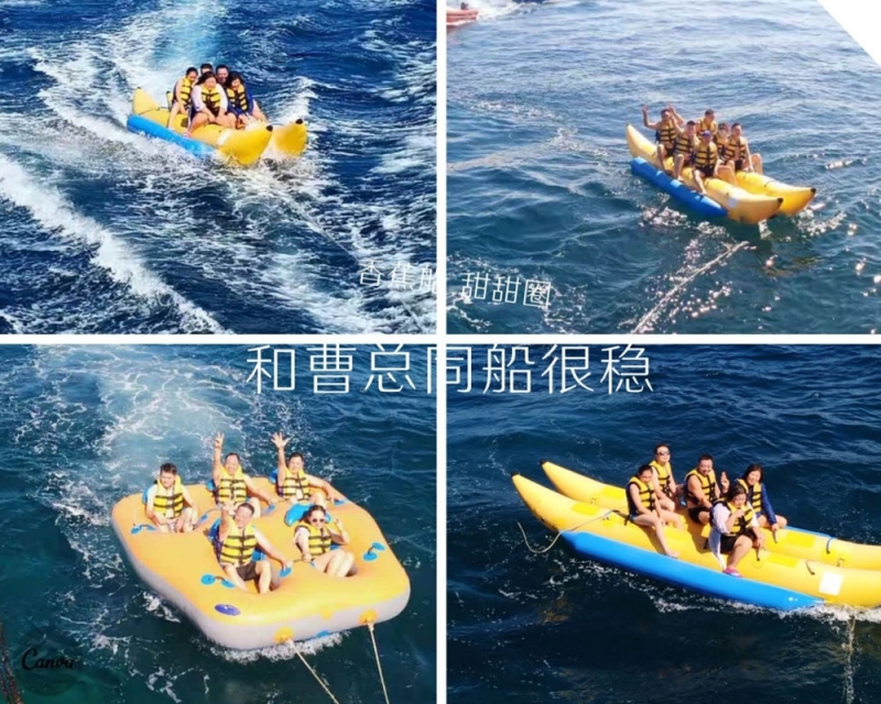 半小时后,我们首先到达了海中间由两艘游轮搭建的漂浮“海上游玩基地”,除了“香蕉船”“甜甜圈”和“浮潜”这些项目,最有意思的是“跳海”,作为非专业队员,大家入水姿势各异,激起巨大的浪花。遗憾的是,“女神”曹总并没有参与“跳海”,估计她是为大家着想,怕入水海平面升高2米,淹没“基地”,多年以后,我还是要感谢曹总的“不淹之恩”,让我依然可以坐在在夕阳下回忆往昔。