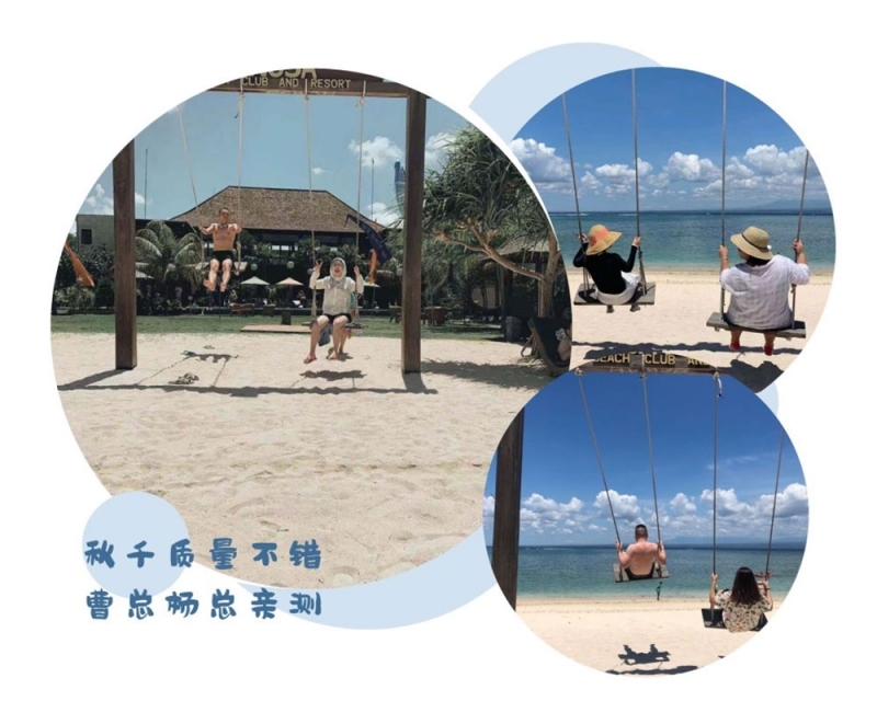 梦幻海滩的海水恐怕是巴厘岛最清澈明净的,海风如酒,海天苍苍,如镜面的天空和海水。在海面上划行“独木舟”,宛如漂浮在澄澈的天空之境。而海滩上的秋千,面朝大海,大家争相坐在秋千上拍照,经过曹总和杨总亲自检验,证明虽然是木质秋千,但是质量诚不欺我。