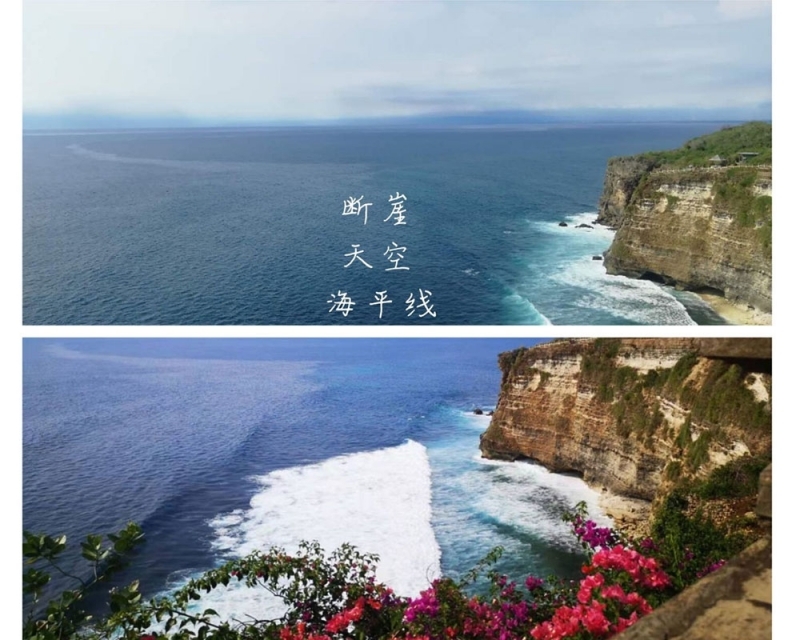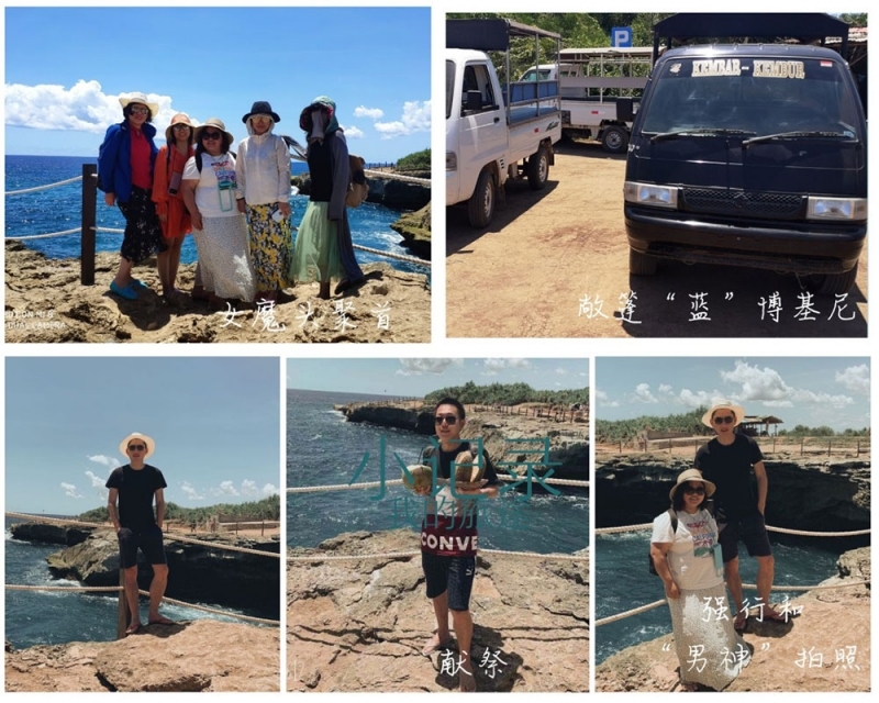 乌鲁瓦图断崖位于巴厘岛的最南端,是我们此行的最后一站,沿途的猴子据说会抢游客的帽子和眼镜,让我们一路有些忐忑,生怕遭遇这些“劫匪”。当我们终于站在断崖的最高处,远处海平线和天相接,海色融于天空,在别处很难看到如此开阔的海平线,颇为壮观。而断崖下水石相搏,浪花翻涌,又别是一番景致。大家纷纷驻足拍照,而见到金发美女就求合影的马工更是没有放过这个绝好的机会,和三位美女留影合照,炽烈的阳光下,马工漆黑的肤色优势仿佛也没成功抢镜。